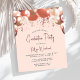 This festive graduation party invitation features a rose gold and burgundy balloon arch garland over streaming ribbons and confetti. The word "Graduation" and the graduate's name appear in modern burgundy handwriting script. Add the party details in black sans serif font on a blush pink background. The balloon arch and confetti design is repeated on the reverse side of the card.