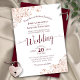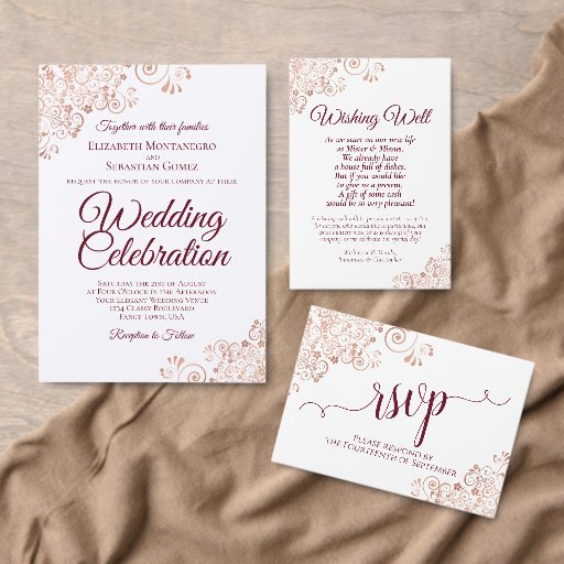 This beautiful wedding invitation features a simple yet elegant design with burgundy script calligraphy on a classic white background and frilly rose gold faux foil lace filigree in the corners. The typography and layout are elegant and classy. Wonderful way to invite your friends and family to share in your joy on your special day.