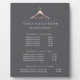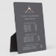 Elegant plaque with easel displays your services or price list beautifully. Perfect for tailors, seamstresses, personal shoppers, dry cleaners and more, this chic design features classic white lettering on a refined medium grey background adorned with faux rose gold foil clothes hanger illustration. Includes three customisable headings and body text fields, and space for your business contact information along the bottom. To adjust layout, enter your text and then use the Customise function to change positioning and font sizes.