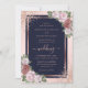 Elegant navy blue, blush and rose gold floral wedding invitation featuring a rose gold frame adorned with blush pink roses and rose gold confetti.