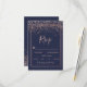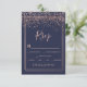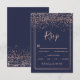 Rose gold confetti navy blue script border rsvp card