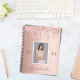A rose gold background with rose gold drips, paint drip look. Templates for your own photo, year and title. The title is written in dark rose gold with a large modern hand lettered style script. Perfect for school, work or organizing your personal/family life