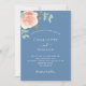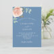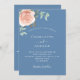 A dusty blue background. Decorated with a rose gold and blush pink floral, rose flower and green watercolored eucalyptus leaves, sprigs, greenery and faux gold sprigs. Personalise and add your names and wedding details.