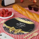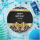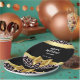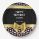 This elegant birthday paper plate design features a rose gold Egypt geometric pattern with a gold bow ribbon on a black background.