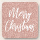These trendy holiday party coasters feature the words "Merry Christmas" in elegant handwriting-style brush font in white on a rose gold faux glitter background.