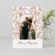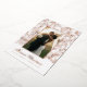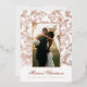 Send merry wishes of the season and share your happy news with family and friends on this wedding themed Christmas card. Swap the phot for your best shot from the big day and edit the name and date on the front, plus personalise the long message on the back with your own heartfelt sentiments. The traditional and timeless motif of carved wood work and filigree artisanship shine in real metallic rose gold foil to bring festive glamour to this dual purpose wedding announcement and winter holiday greeting card.