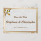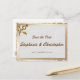 An elegant rose gold save the date announcement postcard, featuring a floral edging of gold flowers, gold metallic frame with golden flower in the corner, and a white linen look background. All details can be customised. Other colours are possible too - just click on the Contact link above to request a change.