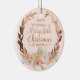"Rose Gold Floral Elegant Christmas Blush Glitter Photo Ceramic Ornament." Modern trendy earthy colours with boho watercolor floral, copper leaf foliage wreath and rose gold glitter look script typography lettering that reads, "Have yourself a Merry Little Christmas," and your family name personalised. On the reverse side your family photo and the year. All artwork was created by internationally licensed artist and designer, Audrey Jeanne Roberts, copyright.