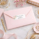 A rose gold and blush pink rose, floral and eucalyptus greenery and faux gold foliage. Personalize and add your name and address. Black letters.