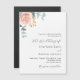 A chic white background. Decorated with a rose gold floral, green watercolored eucalyptus leaves, sprigs, greenery and a faux gold sprig. Personalise and add your names and wedding details. Black letters.