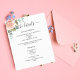 A modern, elegant wedding details/program/timeline. A white background, decorated with a rose gold, blush watercolored rose and eucalyptus greenery. Personalise and add your names and wedding details. Black coloured letters.
