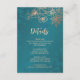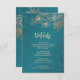 Rose gold floral line art cherry blossoms on a shimmering teal background. Matching wedding invitation available.
