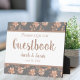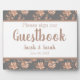 Customisable guestbook tabletop sign for wedding features handwriting style font on grey background with rose gold floral framed overlay and centre white text box.