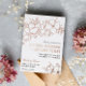 Floral rose gold and white wedding invitation with line art of flowers and greenery and a combination of romantic elegant fonts and modern fonts in grey and rose gold foil. Rose gold floral wedding invitation with hand drawn flower elements.