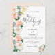 A trendy floral wedding invitation in white, coral and peach . A chic white background on the front. Decorated with large, lush watercolored flowers, florals in white, coral and peach. Modern large handlettered script, typography with the text: The wedding of. Templates for your first names and wedding details. Dark grey text.