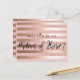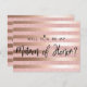 Simple elegant Matron of honour proposal postcard. Design featuring brush script '' Matron of honour'' on a rose gold glitter and foil stripes background. Add your message to the back of this postcard. To edit template click customise further.