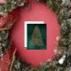This non-photo card features a hand drawn sparkly real foil Christmas tree on a green background. The back is a postcard layout for easy mailing.