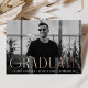 Simple graduation announcement featuring the graduate's horizontal photo with "Graduate" displayed in rose gold foil modern art deco lettering. Personalise the front of the single photo graduation announcement by adding the graduate's name, school, and grad year. The announcement reverses to display a black and white geometric swirl design.