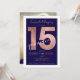 A modern, chic and elegant rose gold metallic foil Quinceañera birthday party invitation with a modern Sweet 15 typography with rose gold foil on an editable navy blue frame background. Add your photo at the back or leave a pink background. Perfect for the princess theme Sweet fifteen!