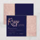 Rose Gold typography on customisable navy blue colour block rose gold glitter, and faux rose gold geometric stripes chic rsvp wedding , perfect for elegant, stylish wedding,