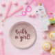 Rose Gold Glitter Blush Pink Ombre Its A Girl Baby Shower Paper Plates. Modern trendy girl baby shower plates with faux rose gold glitter ombre and blush pink choose your own colour background with cute little baby feet footprints.
