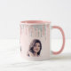 A girly and trendy monogrammed mug. A feminine blush pink background decorated with rose gold and silver glitter drips. Personalise and add a name and monogram letter. Add your own photo x 2. Black and grey coloured letters. The name is written with a modern hand lettered style script.