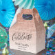 This beautiful favour box features faux rose gold glitter and your custom text along with the word Celebrate in fancy script. Use the template form to add your information. The Customise feature can be used to change the font and the text layout. You can also add text to the other side of the favour box.