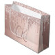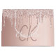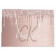 A rose gold faux metallic looking background with faux rose gold glitter drips, paint dripping look. Personalise and add a name and monogram initials. The text: The name is written with a modern hand lettered style script.Perfect for birthdays, baby showers and bridal showers.