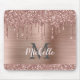 Modern, girly rose gold glitter drips name and monogrammed mousepad. This design features blush pink rose gold glitter sparkle drips on pink brushed metal background with custom personalised monogram initial and first name text template. Perfect feminine gift. Please note, this design is printed photo effect. If you need help or matching items, please contact to me.