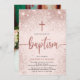 Modern girl Baptism photo invitation. Design features rose gold cross, typography script ''baptism'' and glitter confetti. Personalise with party details on the front and photo of the baby on the back.