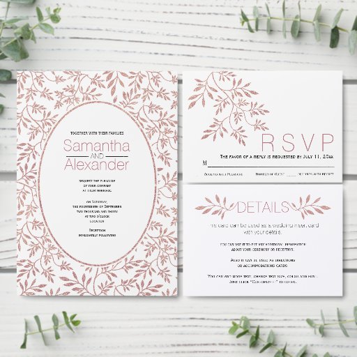 Rose gold glitter leaves pattern wedding invitesDesigned by Modern Designs