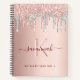 A faux rose gold metallic looking background with elegant rose gold, pink and faux silver glitter drips, paint dripping look. Personalise and add a name, monogram letter and a title. The name is written in burgundy with a large modern hand lettered style script with swashes. Perfect for school, work or as a your secret diary.