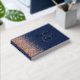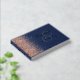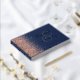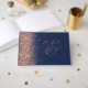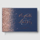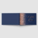 This elegant wedding guest book features a rose gold faux glitter border on a navy blue background. Easily customise the real rose gold foil text, with the names of the couple in whimsical handwriting calligraphy over a large ampersand. Add additional text of your choice to the front and spine.