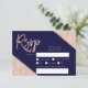 Rose Gold typography on customisable navy blue rose gold glitter colour block, and faux rose gold geometric stripes chic rsvp wedding , perfect for elegant, stylish wedding,