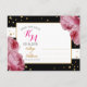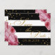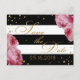 Pink roses over black and white background with gold glitter-effect confetti modern floral save the date postcard.