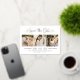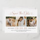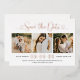 Modern rose gold foil, black, and white wedding save the date announcement cards feature a collage of three square engagement photos and a stylish typography design with chic calligraphy script and a heart accents. The simple and elegant custom text that can be completely personalised with the numerical wedding date, bride and groom names, ceremony location, wedding website, and formal invitation to follow wording.