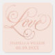 Seal your wedding favours with romantic elegance using this rose gold love script monogram square sticker. Ornate "Love" calligraphy in rose gold is paired with the couple's names and wedding date on a soft blush pink background. The warm metallic script against the feminine blush palette creates a dreamy, sophisticated accent. Perfect for favour bags, gift boxes, or wine bottles. All text is fully customisable.