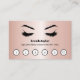 This modern and sophisticated loyalty card design features a glamourous , minimalistic illustration of a woman's eyelashes in black over a super trendy rose gold or copper satin background with bold name or business name and title. and six punchout circles in white with rose gold border.