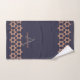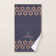 Personalise this monogram Netilat Yadayim hand towel for the ritual washing of the hands as a gift for Purim, Passover or any holiday or special occasion. The deep Eclipse navy blue background features a double row of faux rose gold glitter Star of David symbols on both edges. Your optional monogram initial in a soft grey decorative font is overlaid with your name, also optional, in a dusky pink mauve colour and simple block letters on side of the hand towel. For your own family, as keepsakes or special gifts, these personalised ritual Netilat Yadayim towels with the rose gold Magen David motif make a beautiful presentation.