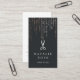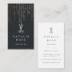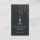 Simple and elegant vertical business card design for hairstylists features classic white lettering on a rich soft black background with vertical strands of faux rose gold foil string lights cascading from the top. Personalise with two lines of custom text on the front beneath a pair of stylist's scissors, and add your full contact information to the reverse side.