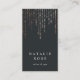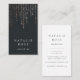 Simple and elegant vertical business card design features classic white lettering on a rich soft black background with vertical strands of faux rose gold foil string lights cascading from the top. Personalise with two lines of custom text on the front, and add your full contact information to the reverse side.