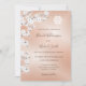 This elegant modern wedding invitation features white shimmering cherry blossoms and two cute butterflies on a rose gold background. Bride and groom names in an elegant handwritten script.