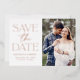 Announce your wedding date in style with our modern photo save the date cards. The front of the design features your engagement photo with "Save the Date" displayed in rose gold foil serif and script fonts against a white background. Personalise the front of the photo save the date card by adding your names, wedding date, and wedding location. The elegant save the date card reverses to display a black and white trellis pattern.
