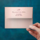 A faux rose gold metallic looking background. Personalise and add your monogram initals, name and address. Your monogram as a pattern inside. Your family name's initial in the middle with a capital letter. The names are written with a modern and trendy handlettered style script. Dark rose gold coloured letters. Perfect for wedding invitations and thank you cards!