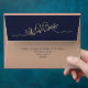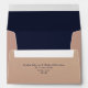 Elegant, modern, minimalist, simple rose gold and navy blue 5x7 envelope for wedding invitation with return address and unique hand drawn couple love birds drawing.