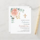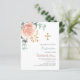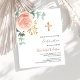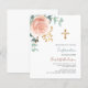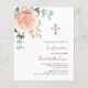 Rose gold and blush pink florals, eucalyptus greenery and a golden cross. Personalise and add a name and details.