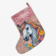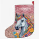 Elevate the Equestrian Spirit of the Holidays with Our Rose Gold Pink Equestrian Horse Sweet Name Large Christmas Stocking! The design features a whimsical white horse with a rainbow colourful mane.