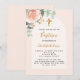 Rose gold, blush arch background decorated with a rose, eucalyptus greenery and a golden cross. Personalise and a name and ceremony details. Black and golden coloured letters.