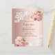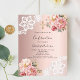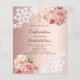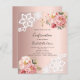 An elegant Confirmation invitation. A rose gold gradient background decorated with pink and rose gold florals, roses, lace and a golden cross. Personalise and add a name and details.