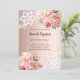 A rose gold gradient background decorated with pink and rose gold florals, roses and lace. Personalise and add a name and party details.